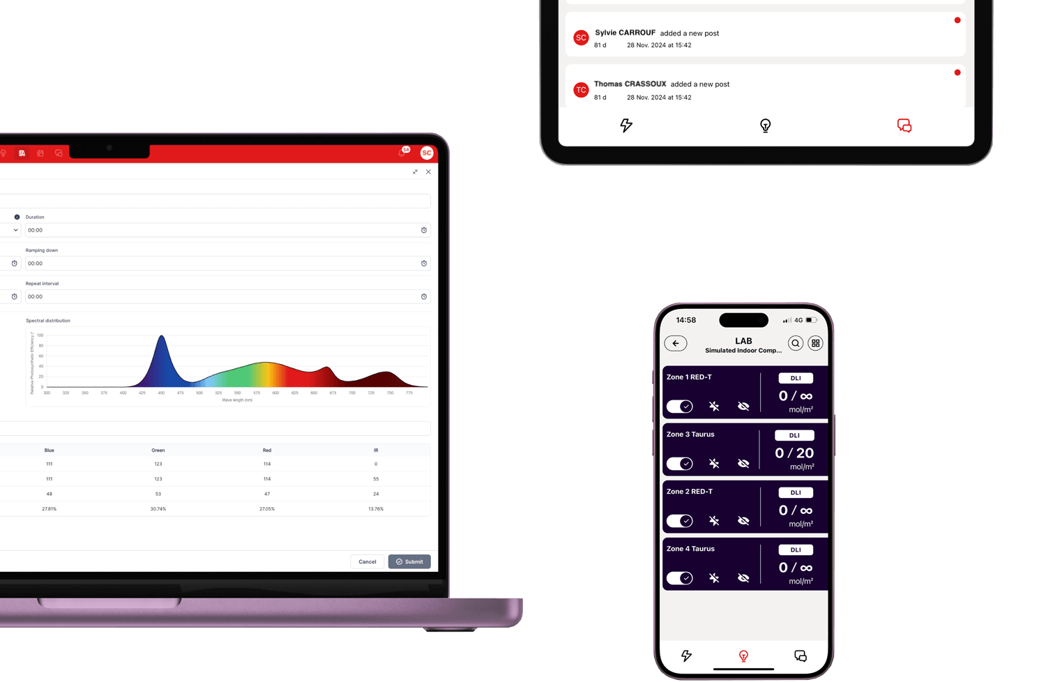 With MyRED, send the right light at the right time to your crops! Ensure you achieve your goals by adjusting your lighting in real-time based on the climatic environment and your plants’ needs. A culmination of our technological and photobiological expertise, MyRED optimizes your energy consumption while maximizing your crops’ performance.